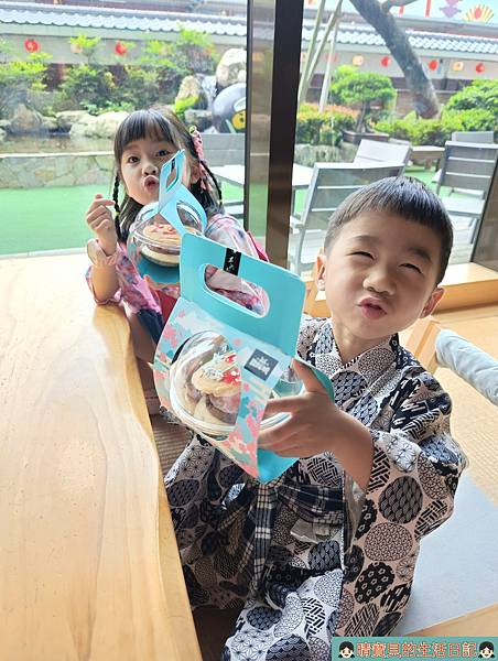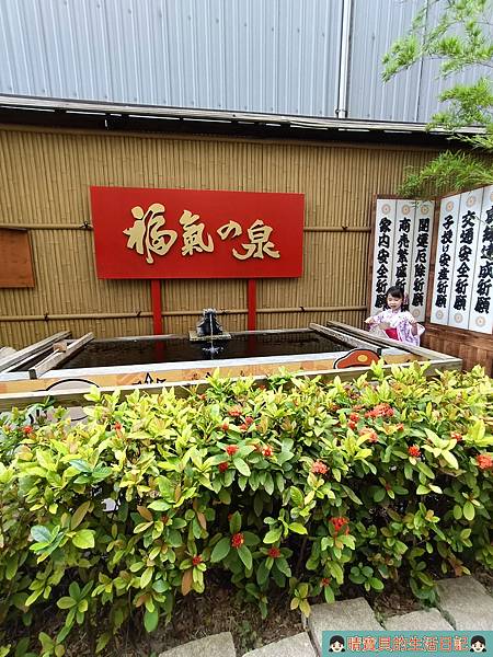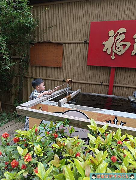 戶外還有一個福氣之泉,兩個孩子看到一旁的遊客去舀水,也跑去體驗。體驗完後也累了,於是決定回室內稍作休息並開心享用自己做的銅鑼燒,頻頻都說自己做的好吃。