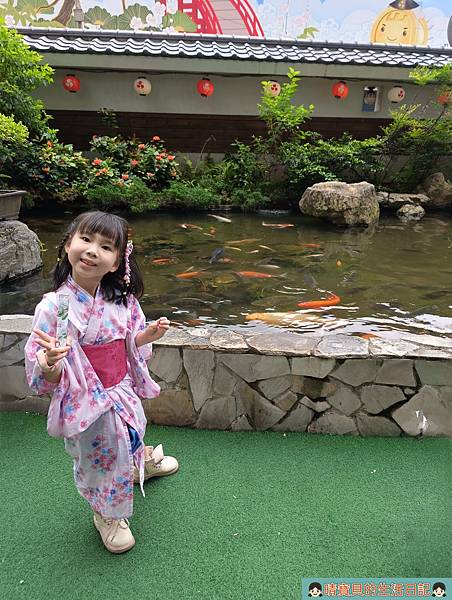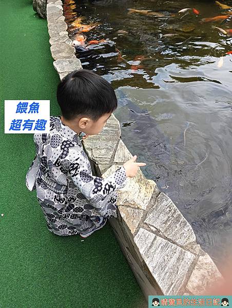 兩個還不忘去魚池餵魚,魚池裡面的魚依舊是相爭搶食,就連烏龜也不遑多讓,但孩子在餵食時要記得手不要太靠近水面,避免受傷!若天氣涼爽,想在外面欣賞風景,外面還有座位區可以坐,非常方便。
