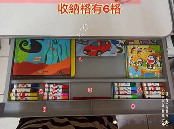 晴晴的書桌我是選擇AC-J105美隊旗艦升降L型成長書桌( 桌長105cm x 桌深73cm x 桌高56 -76cm),打開抽屜,可以看到的是它的抽屜空間非常的大,它的收納格有6格,不但可以放進小孩子的小讀本還可以放上畫筆和畫冊,晴晴可以依照類型或自己的習慣去決定如何擺放(愛怎麼放就怎麼放),筆槽設計的部分實用性也非常的高,不會像有些市售的筆槽的位置設計較不恰當,進而影響孩子的坐姿或使用上的不便,重點是他們的抽屜滑軌使用的並非材質不好或便宜的五金,非常的好開合,完全不會卡卡的。