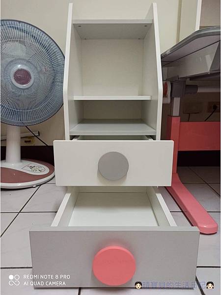 至於為什麼最後會選擇這一款雙層抽屜矮櫃是因為它非常符合我心中的條件,那就是安全且適合晴晴又是台灣製造!它不但有開放空間可以放書,也有抽屜可以放,避免被二寶拿到,最重要的是它是採用品質非常好的德式五金零件而非便宜五金零件,就算晴晴不小心大力關上抽屜也有緩衝防夾手靜音設計不用擔心一不小心會被抽屜夾傷手且抽屜也不會發出 ''碰'' 的一聲會嚇到在睡覺的二寶,全櫃體高度也不會過高,以晴晴的身高來說自己放書學習收納剛剛好,就連把手也和一般抽屜不一樣,它都是採用圓型造型,沒有安全上的疑慮👍,還有四種顏色可以選,不過既然要選擇當然要選擇和晴晴書桌顏色一樣的來做搭配啦😊!另外還有一點我非常喜歡,那就是它一樣是全櫃體採用E1 V313美國富家低甲醛防潮板材,即使孩子貪玩畫在抽屜上也可以輕鬆擦拭,而且它是防潮板材,我們家常常濕氣重,東西容易發霉或壞掉😫,所以在買東西時也要特別注意這點,但樂澄書櫃連這點也做到讓我不用煩惱,真的超級棒的啦!既安全、好清理又防潮耐用的書櫃真的是我最佳的選擇😍。