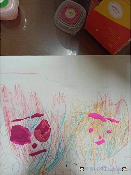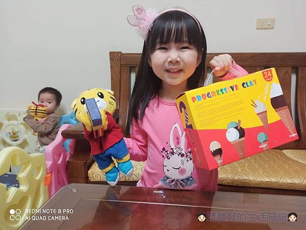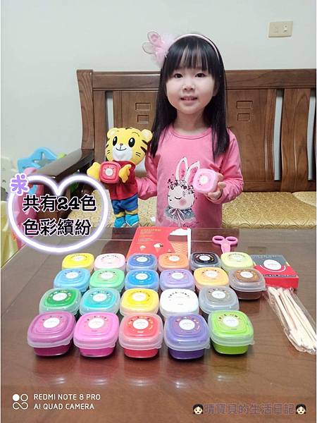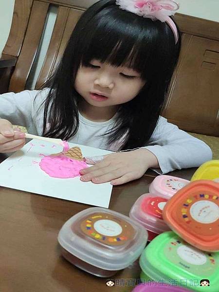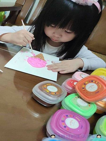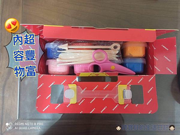因為程程剛好住院,所以開箱時是晴晴和爸爸一起開箱,裡面內容物總共有24色超繽紛的黏土、冰淇淋餅乾杯圖卡3張、空白圖卡5張、黏土工具、安全剪刀、畫框貼紙、夾鏈袋,真的超值的啦!聽說一看到黏土,晴晴立馬吵著要玩,最後玩到欲罷不能,晚餐前後都在玩,最讓我驚訝的是連最愛的電視都不看了😂